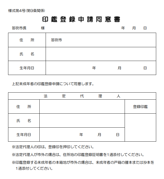 笛吹市のHPでは、未成年者が印鑑登録をする場合の親権者の同意書が載っていました。